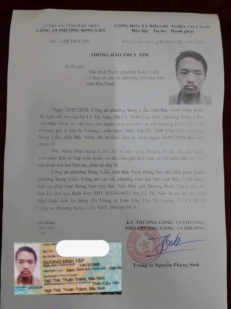 Ngày 24/02/2026, Công an phường Song Liễu đã tiếp nhận đề nghị của gia đình về việc tìm kiếm một người đàn ông rời khỏi nhà nhiều ngày nhưng đến nay chưa có tin tức, khiến gia đình và người thân hết sức lo lắng.