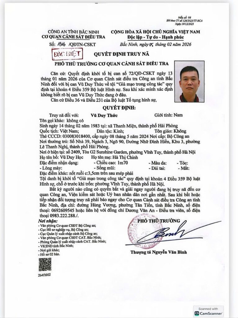 Trước đó, cơ quan chức năng đã khởi tố bị can đối với Nguyễn Đăng Quân về các tội sử dụng tài liệu giả của cơ quan, tổ chức và giả mạo trong công tác theo quy định của Bộ luật Hình sự. Trong quá trình điều tra, bị can đã bỏ trốn khỏi nơi cư trú, gây khó khăn cho công tác xử lý vụ án.