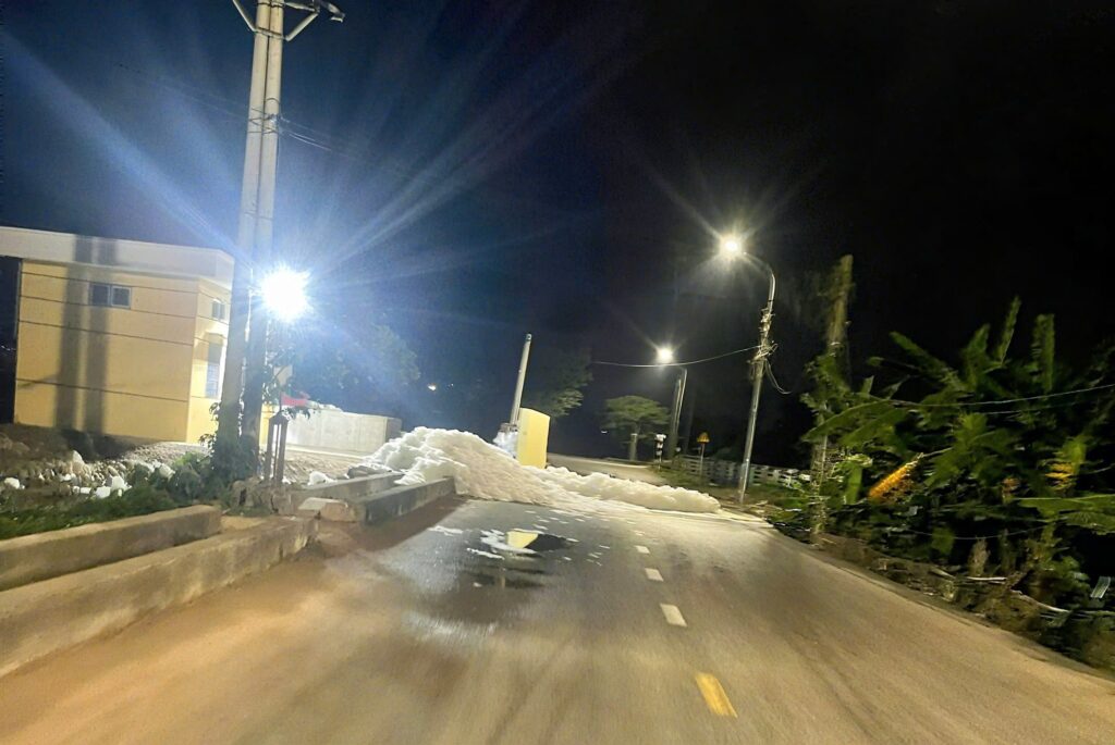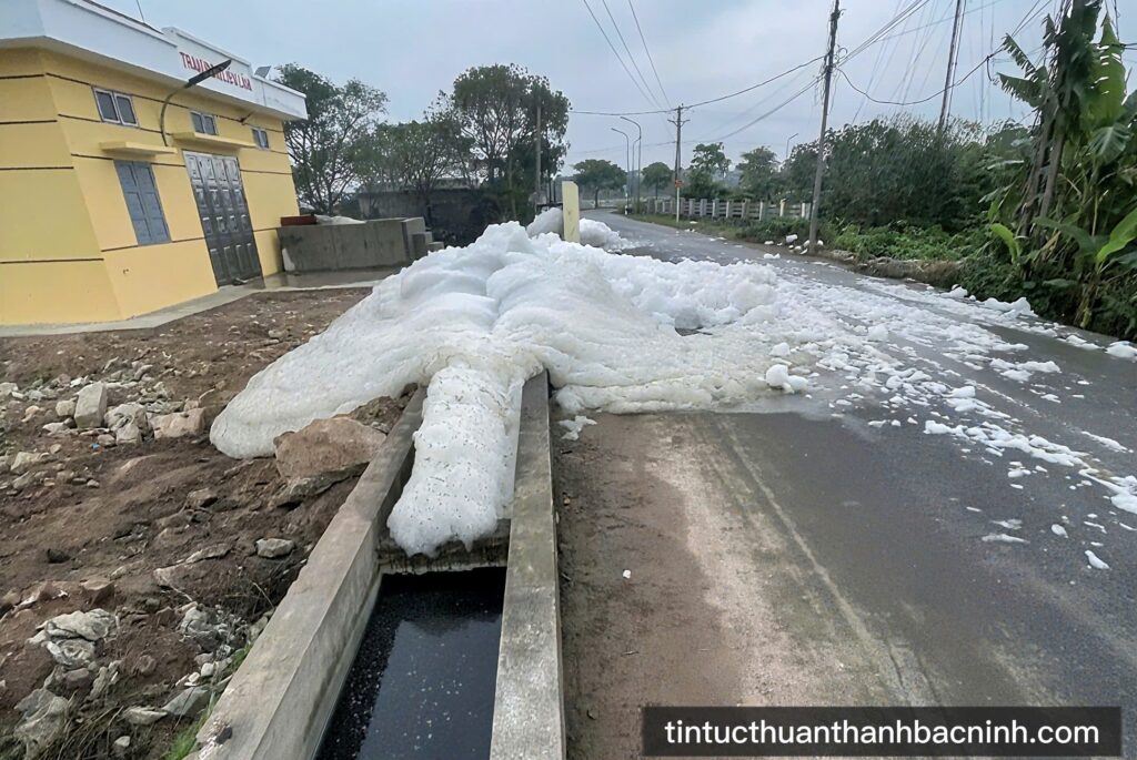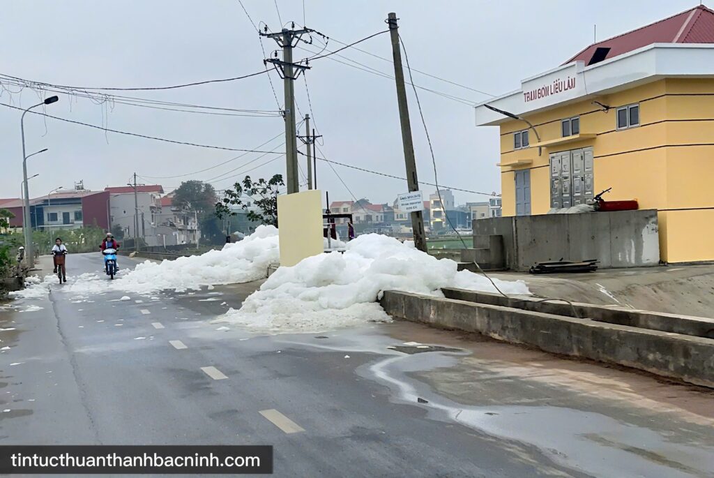 Bọt trắng xuất hiện dày đặc, tràn lên mặt đường tại trạm bơm ở phường Song Liễu.