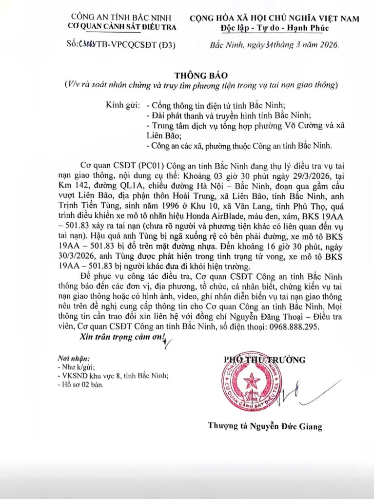 Ngày 31/3/2026, Cơ quan Cảnh sát điều tra (PC01) Công an tỉnh Bắc Ninh phát đi thông báo về việc truy tìm phương tiện tai nạn Bắc Ninh nhằm phục vụ công tác điều tra vụ tai nạn giao thông xảy ra trên tuyến Quốc lộ 1A.